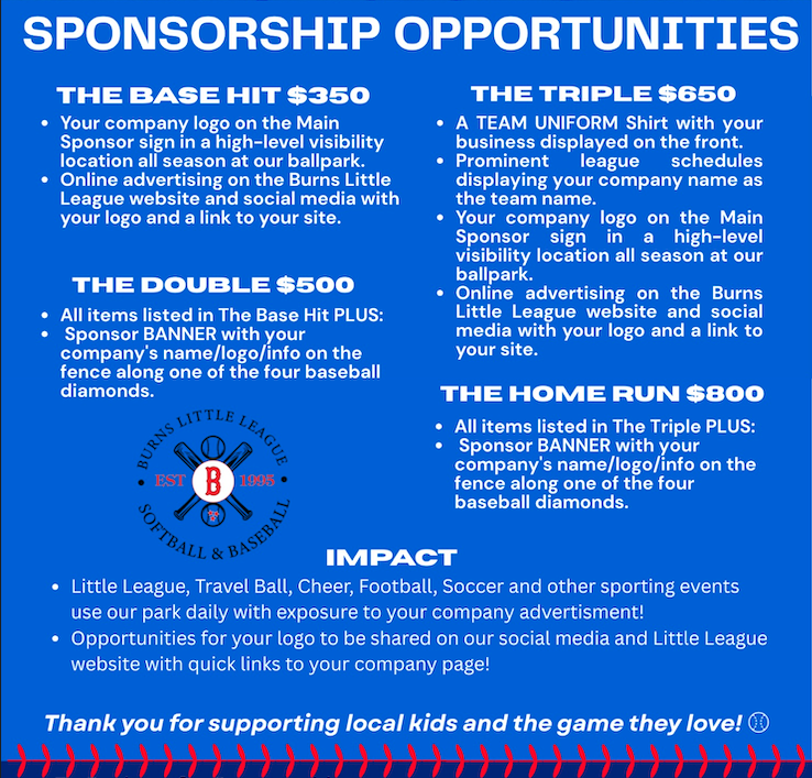 Burns Little League depends strongly on the support of the community both in Burns and countywide to make sure we are providing a fun and educational experience for the children in our area.